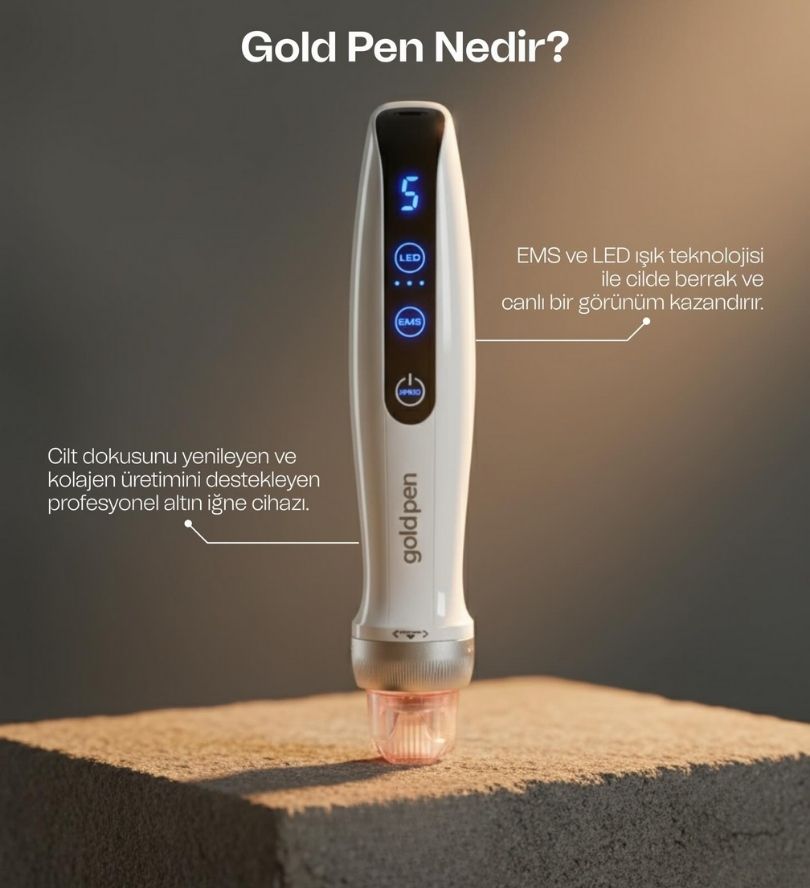 Goldpen, altın iğne sistemine eş değer sonuçlar sunan, EMS (Elektriksel Kas Uyarımı) ve LED Fototerapi teknolojilerini birleştiren yeni nesil bir cilt bakım protokolüdür. Cilt tonunu eşitler, kırışıklıkları giderir ve gözenekleri sıkılaştırır.